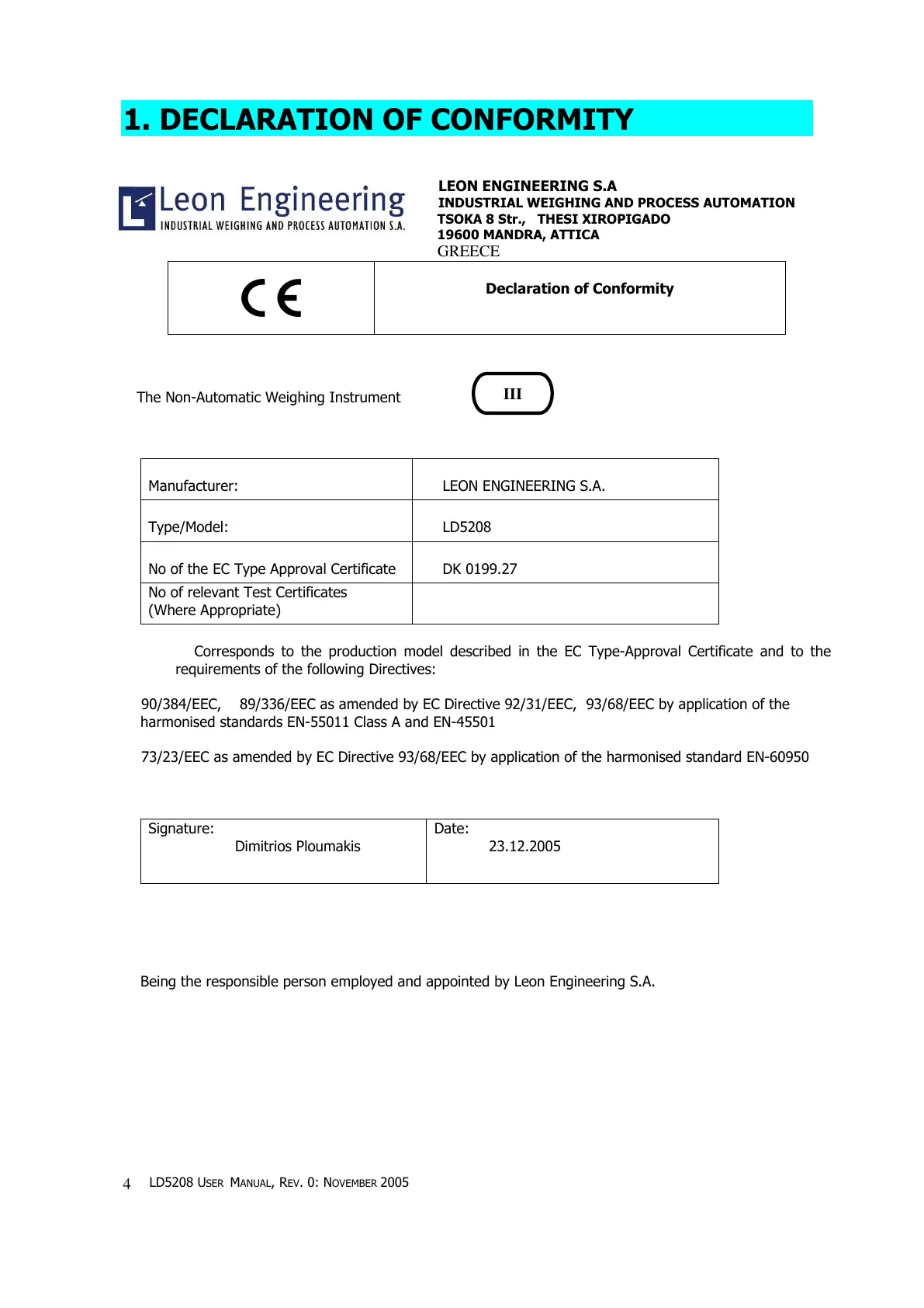 Being the responsible person employed and appointed by Leon Engineering S.A.