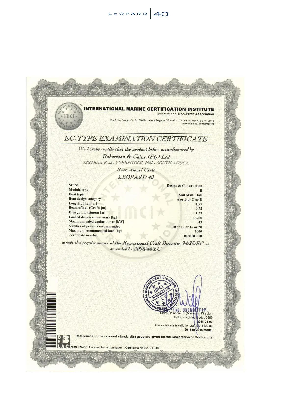 Leopard Catamarans 40 - 1-4.3 Ce Certificate