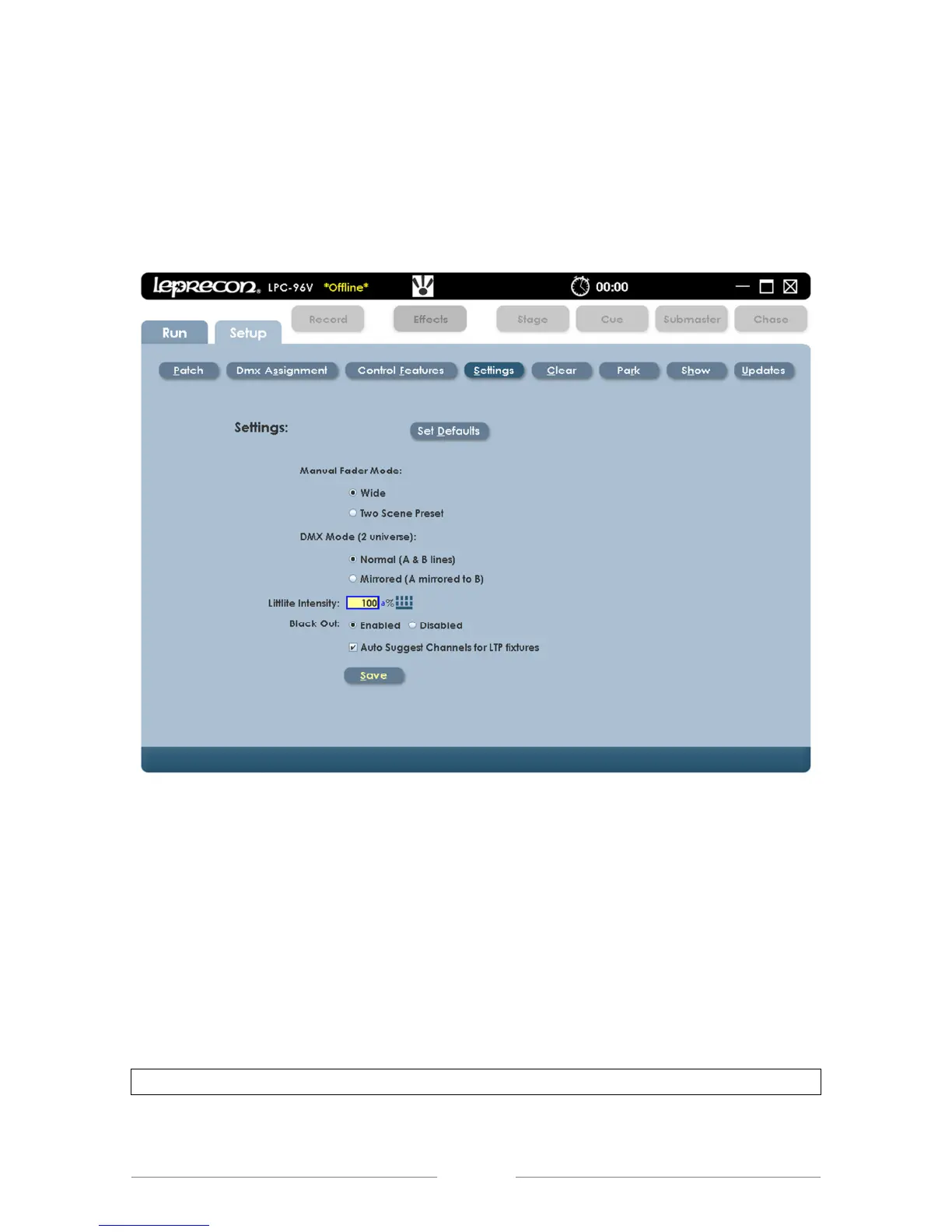 manual fader operation, DMX output, Littlite® intensity, and Blackout enable can