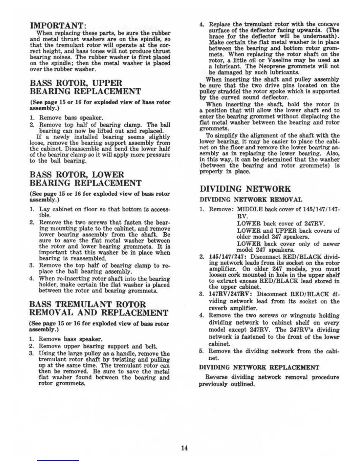 Leslie 145 - Bass Rotor, Upper Bearing Replacement; Bass Rotor, Lower Bearing Replacement; Bass Tremulant Rotor Removal and Replacement; Dividing Network