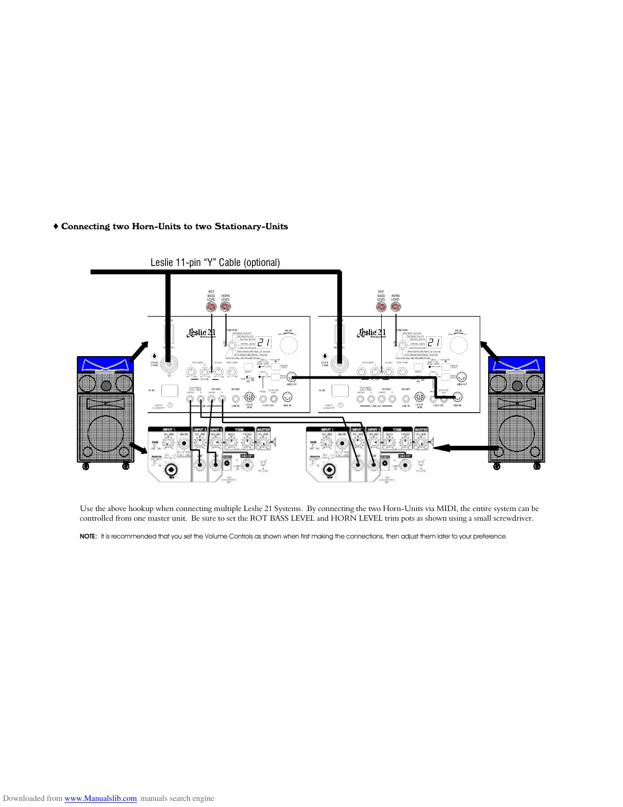 Use the above hookup when connecting multiple Leslie 21 Systems. By connecting the two Horn-Units via MIDI, the entire system can be