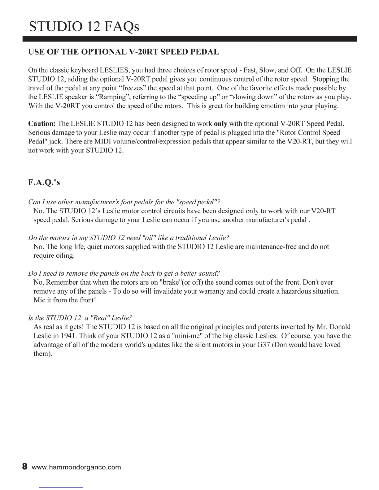 Leslie STUDIO 12 - Studio 12 FAQs; Optional V-20 RT Speed Pedal Usage