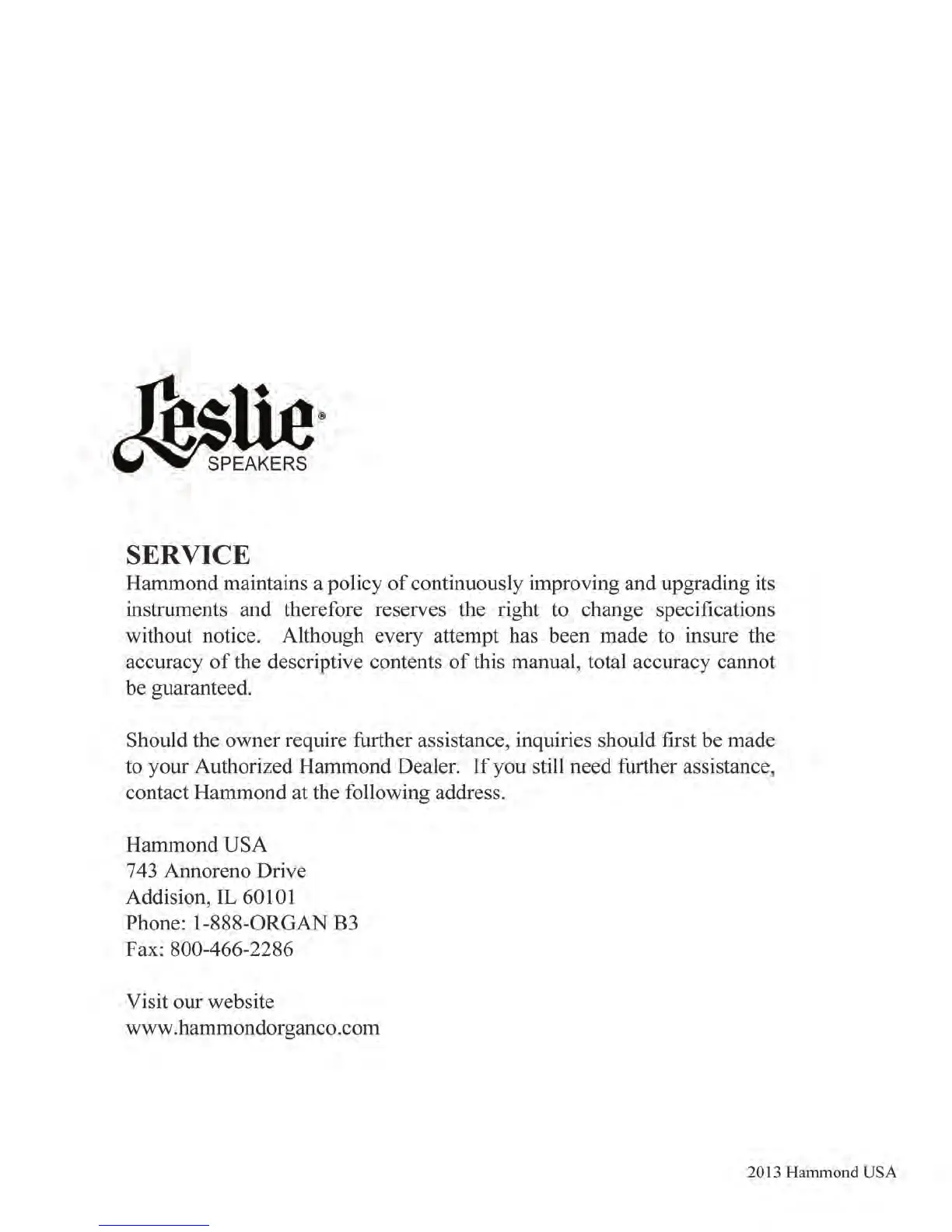 Leslie STUDIO 12 - Service Information