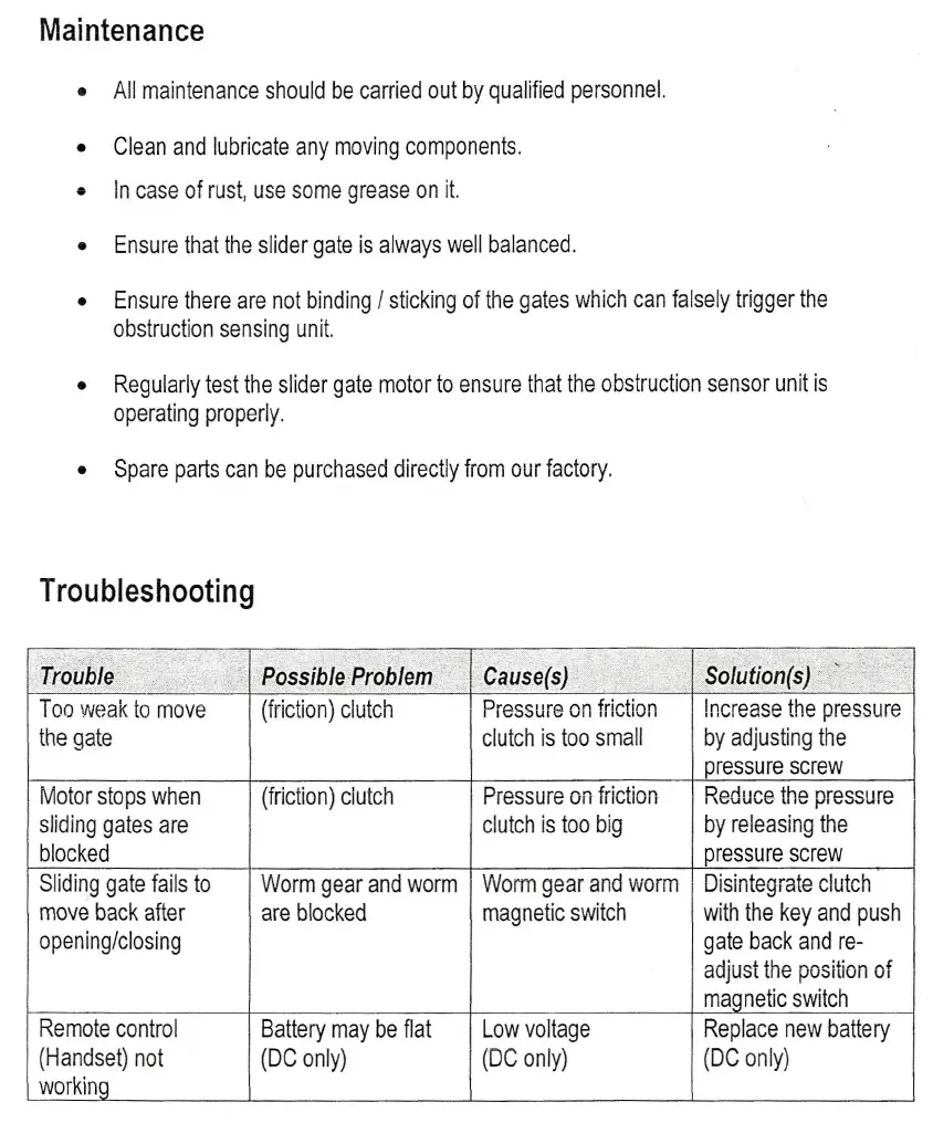 • Regularly test the slider gate motor to ensure that the obstruction sensor unit is