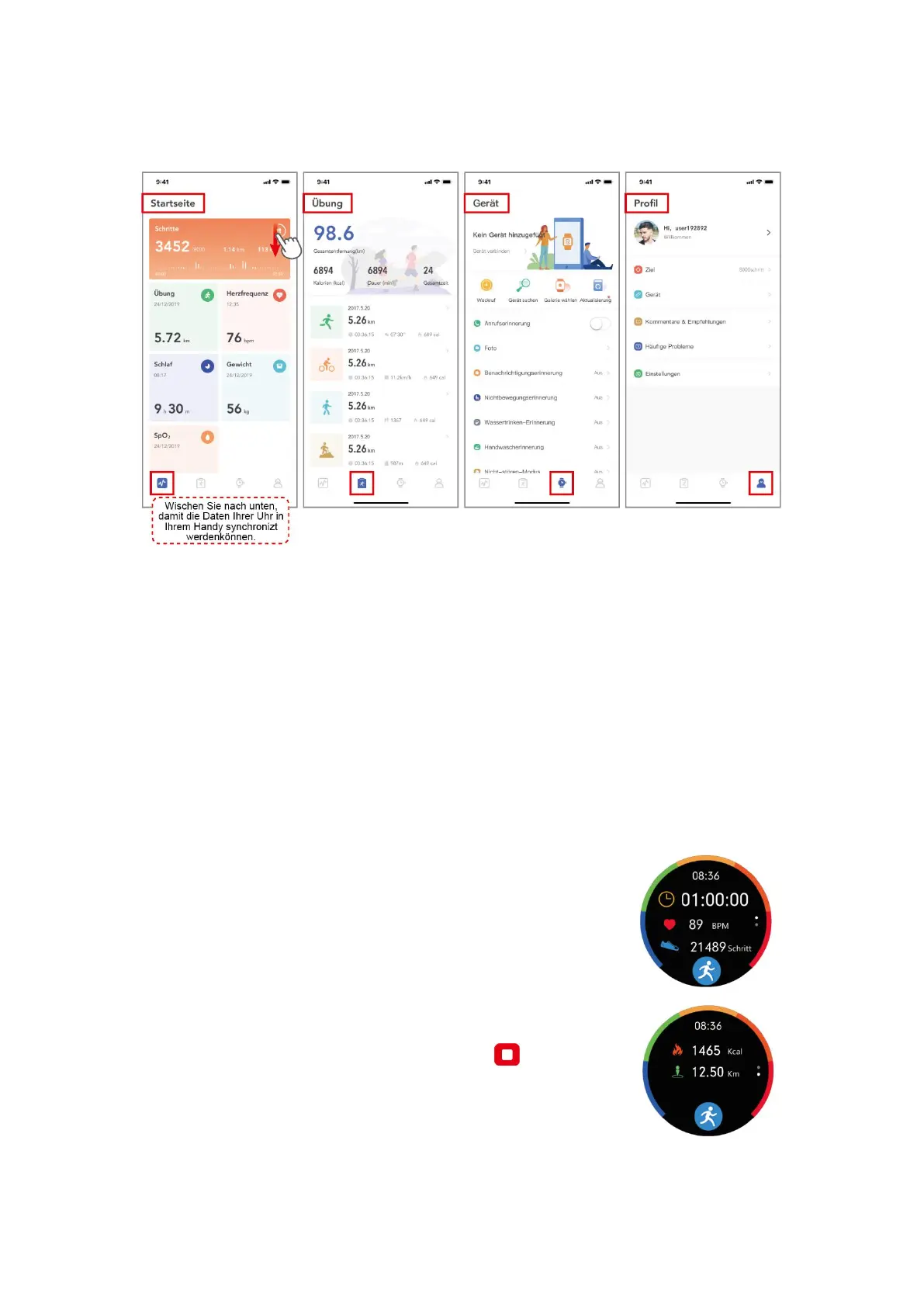 Drücken Sie die untere Taste, um zum Sport-Interface zu gelangen. → Wischen Sie über