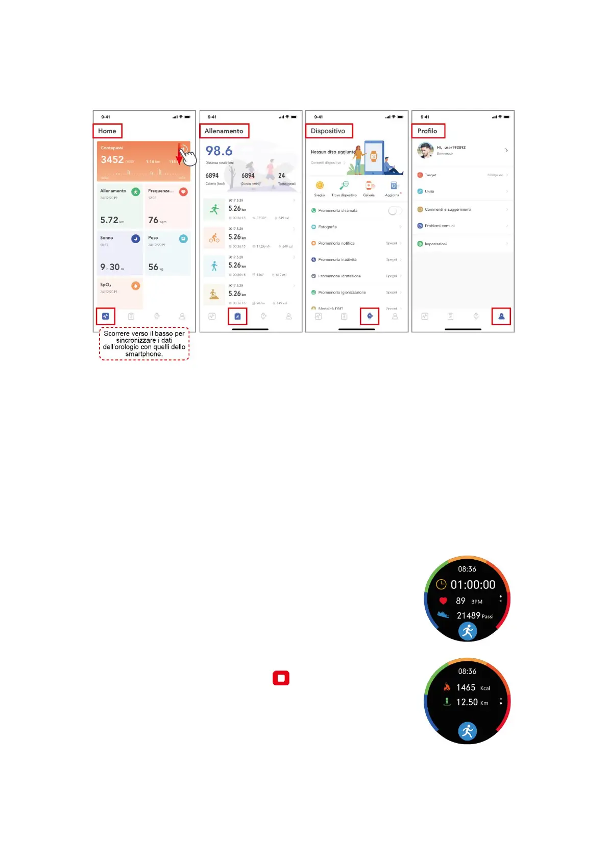 Premere il pulsante in basso per accedere all'interfaccia Sport → Scorrere lo schermo per