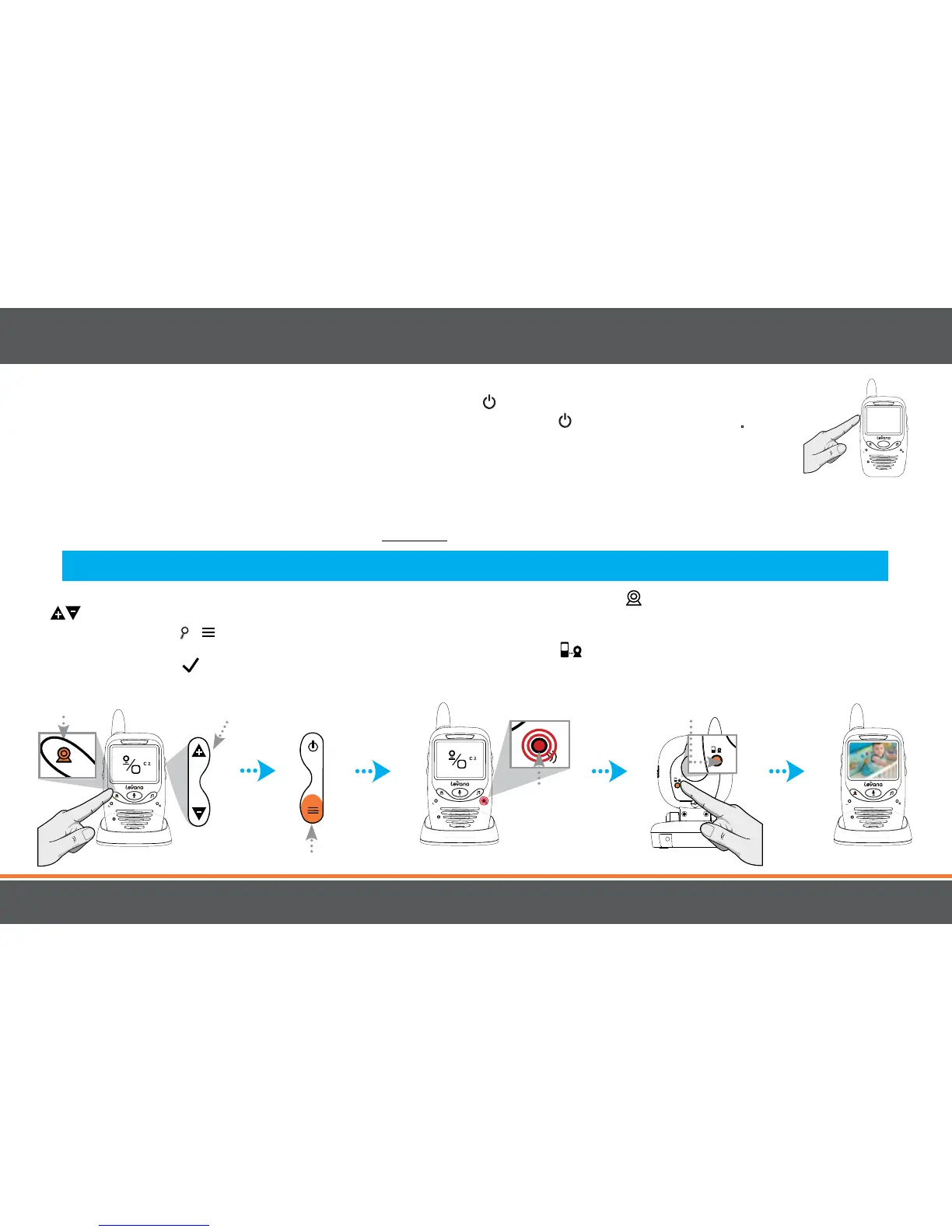 1. Para conectar la cámara y el monitor, presione y mantenga presionado el botón en el monitor. Use las flechas de