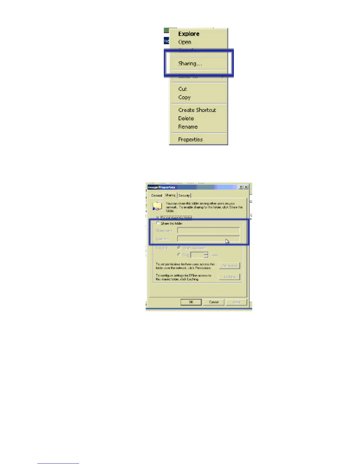 • Activate the selected directory as a share. Select “ Sharing this folder ”.