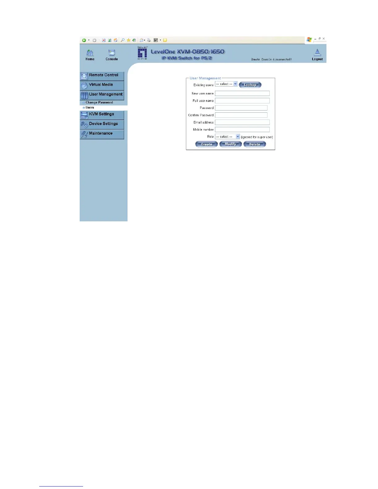 KVM-0850/1650 offers. The account “user” has only the permission to open and use the