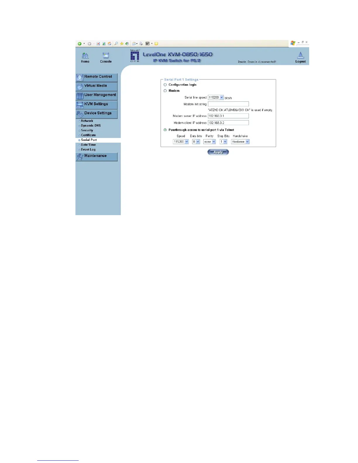 The KVM-0850/1650 Serial Settings (Figure 6-25) allow you to specify what device is