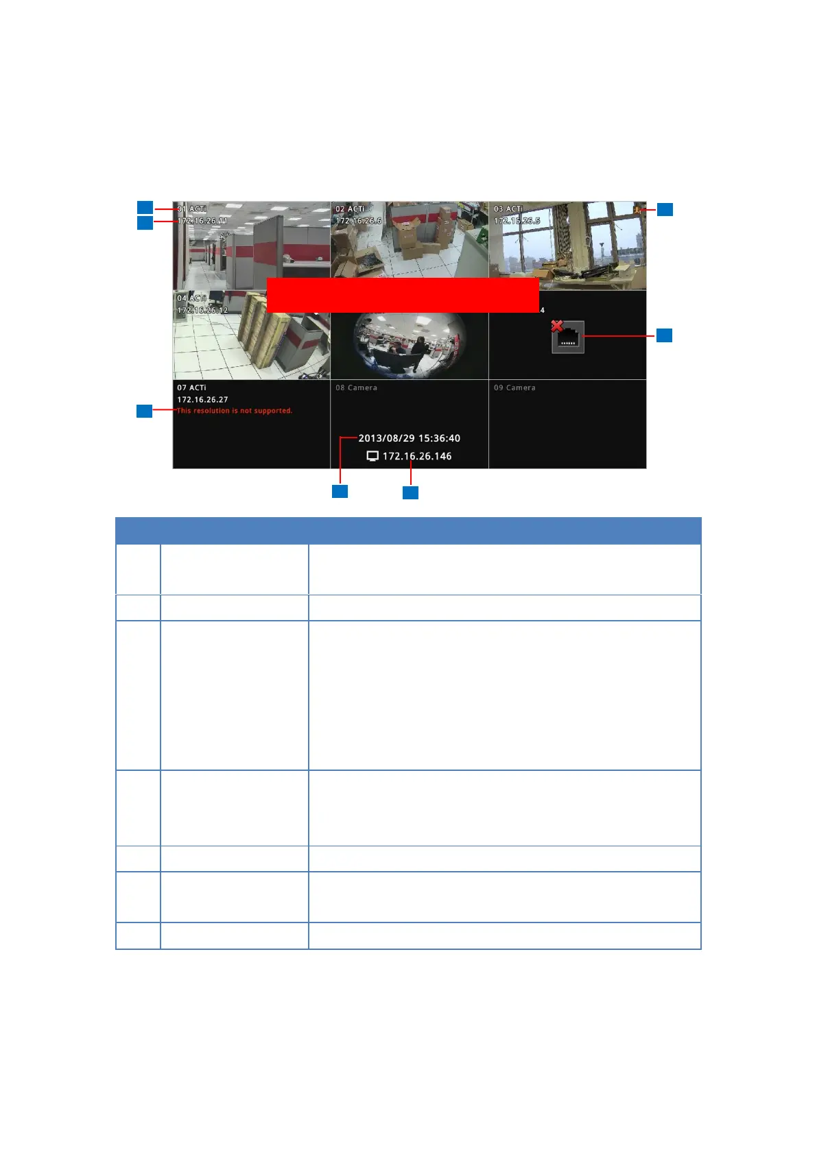 Displays the channel number and camera name.