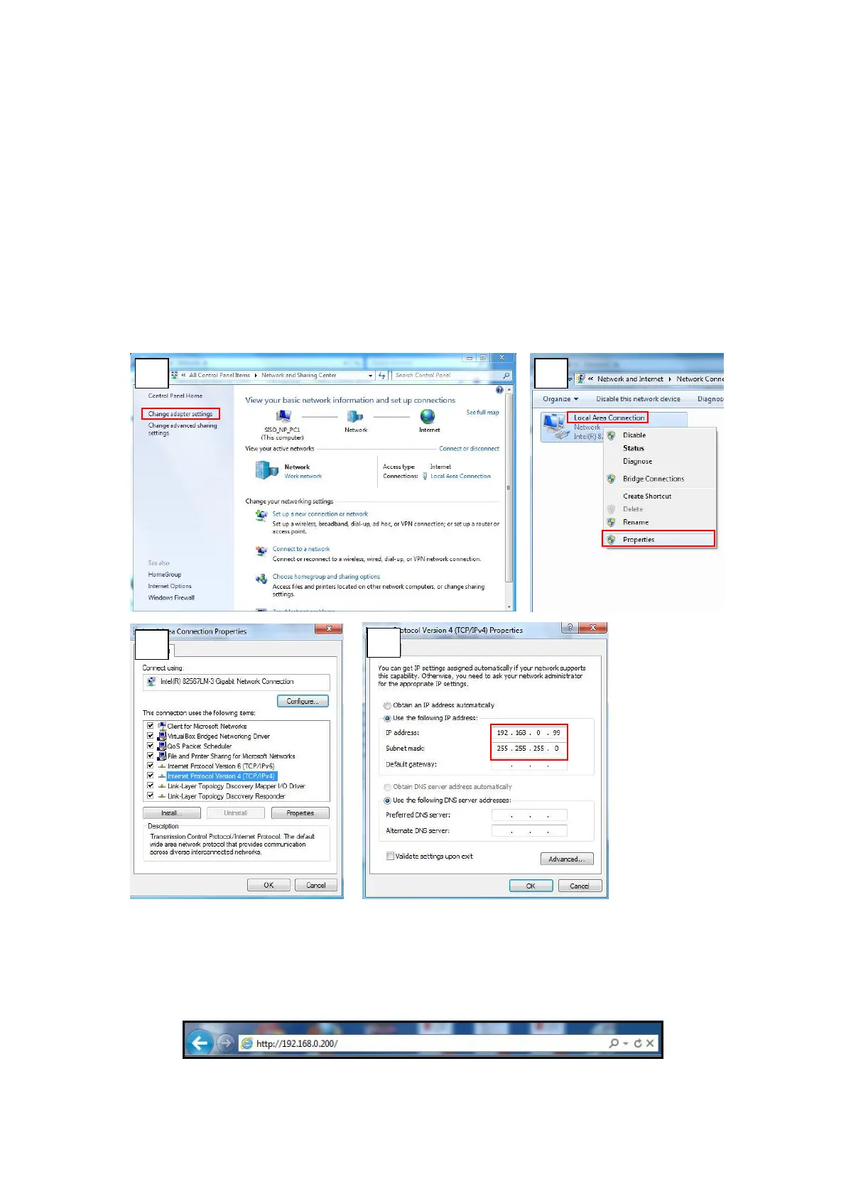 must have an IP address of 192.168.0.X (where X is any number between 1 ~ 255, except 200)