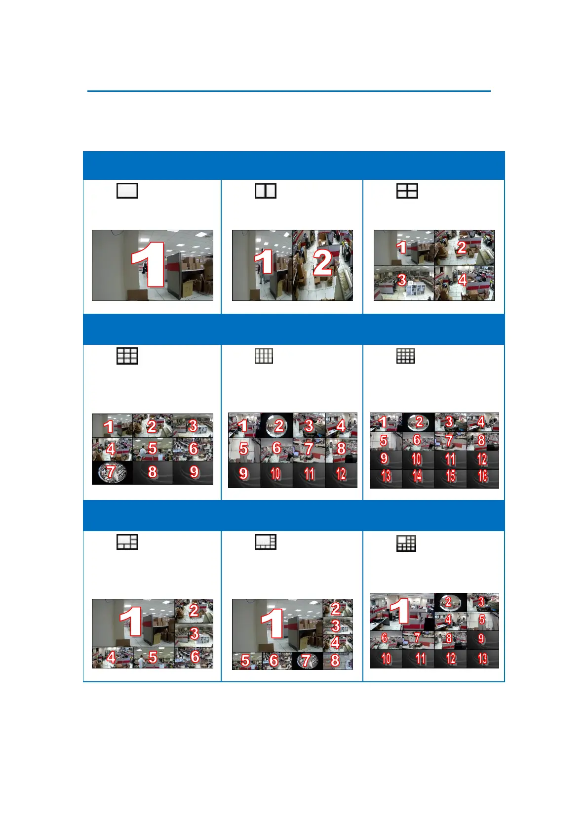 By default, the Live View is displayed with a 9-channel layout. The layout can be changed into