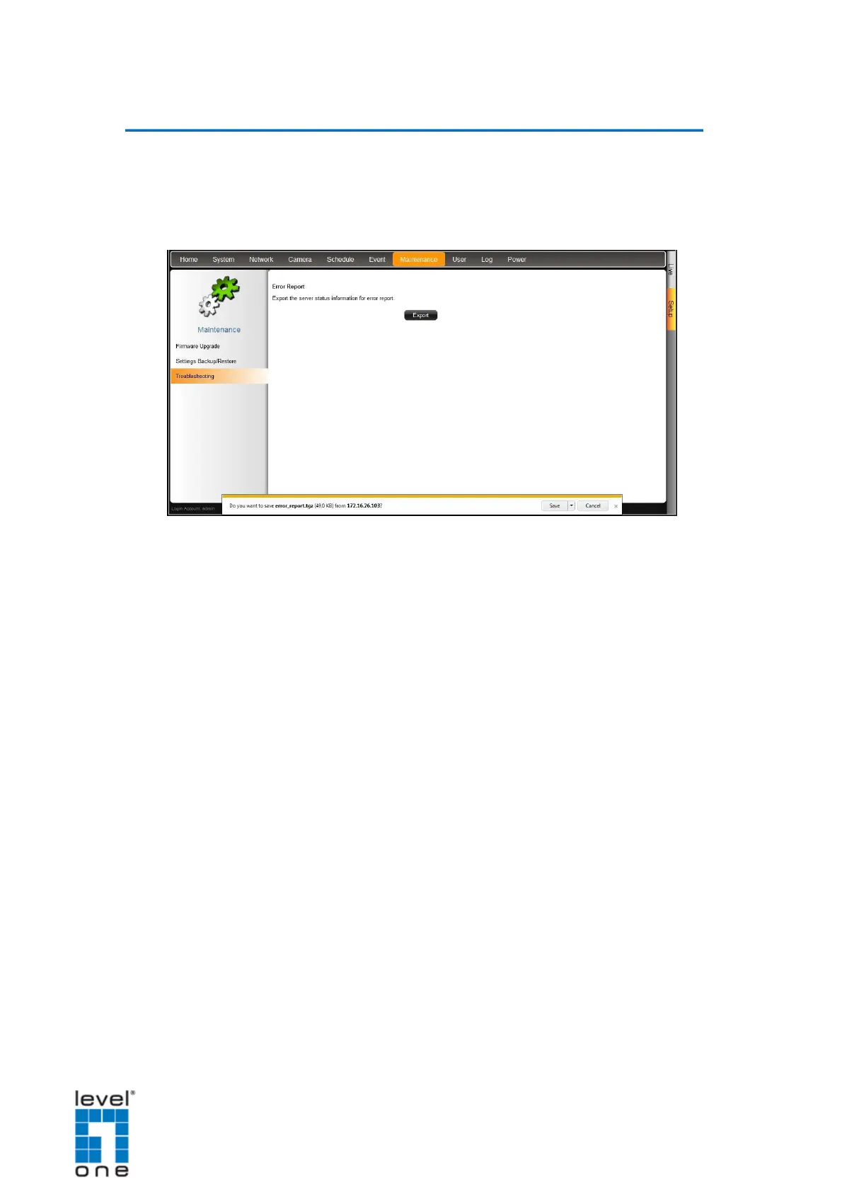 The Troubleshooting page allows users to export an error report (*.tgz) to be sent to the