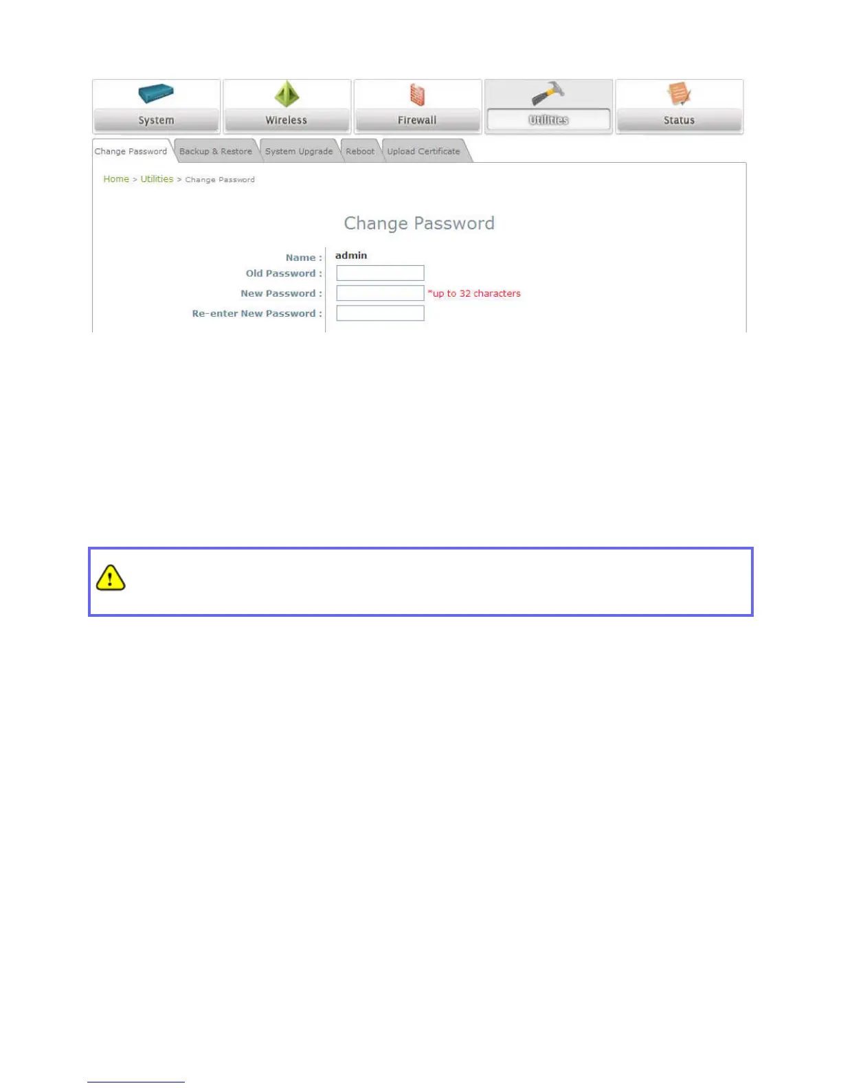 Click on the Utilities main menu button, and then select the Change Password tab.