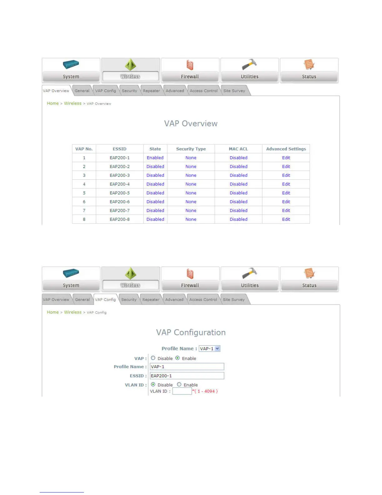 To setup the AP’s wireless access, refer to the following VAP-1 configuration (other VAP configuration