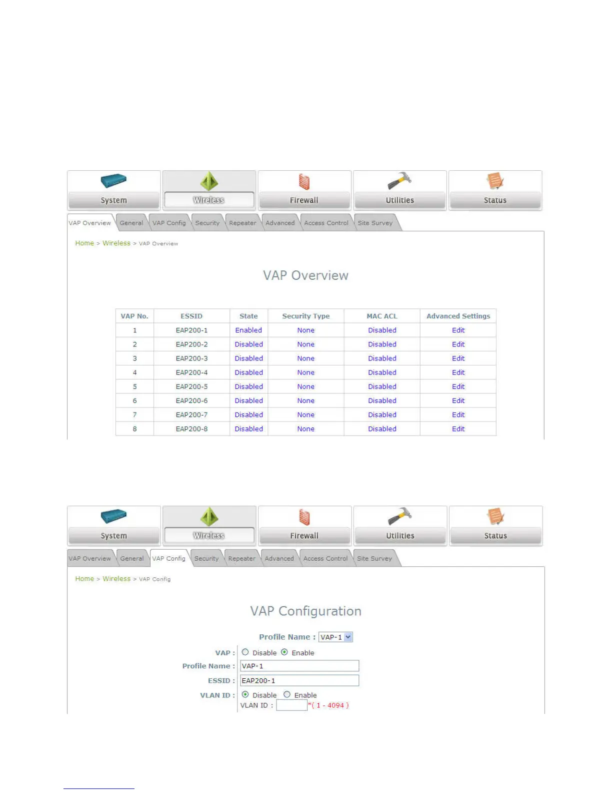 Please click on the Wireless icon to review the VAP Overview page.