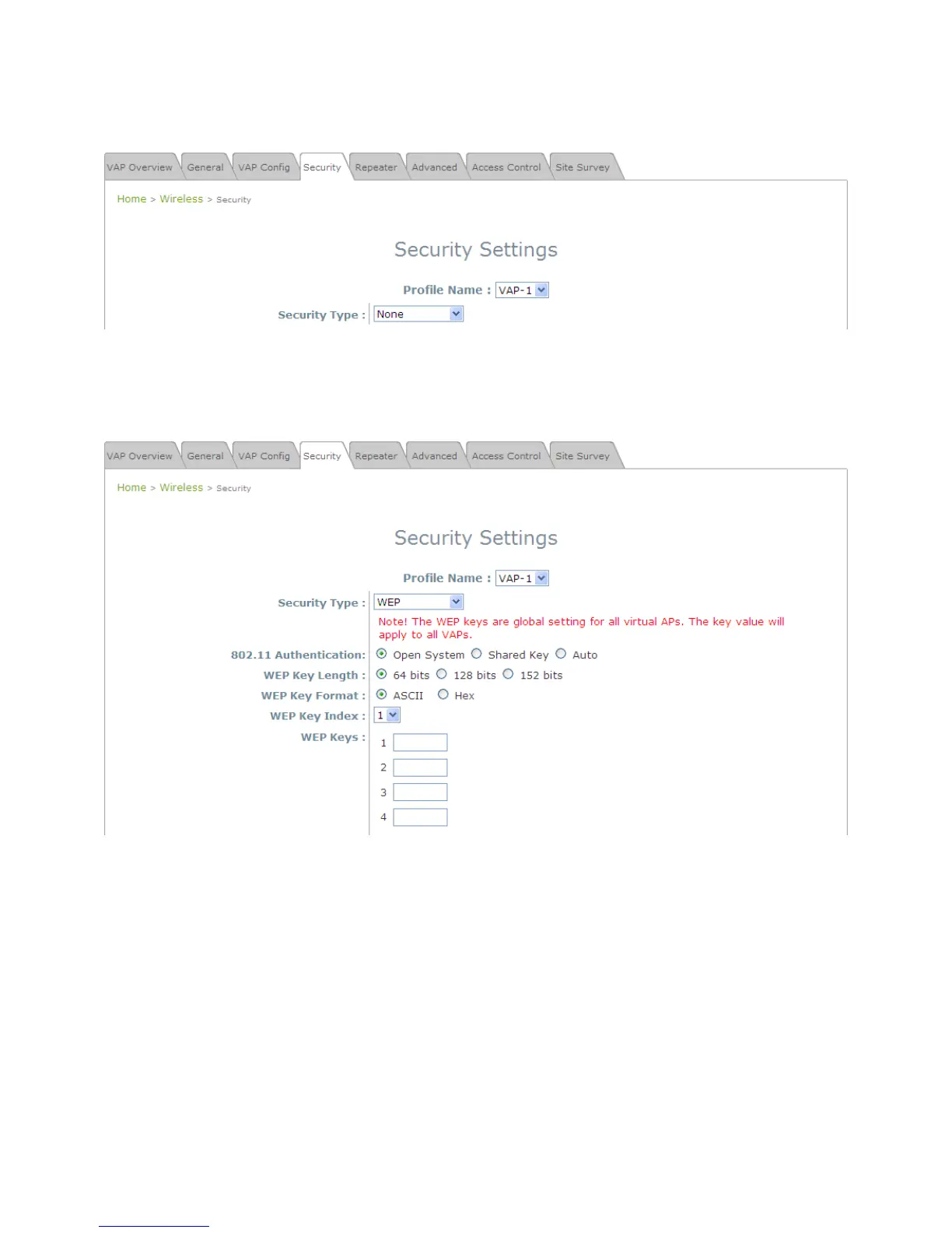 WEP Keys: Provide the pre-defined WEP key value; the system supports up to 4 sets of WEP keys.
