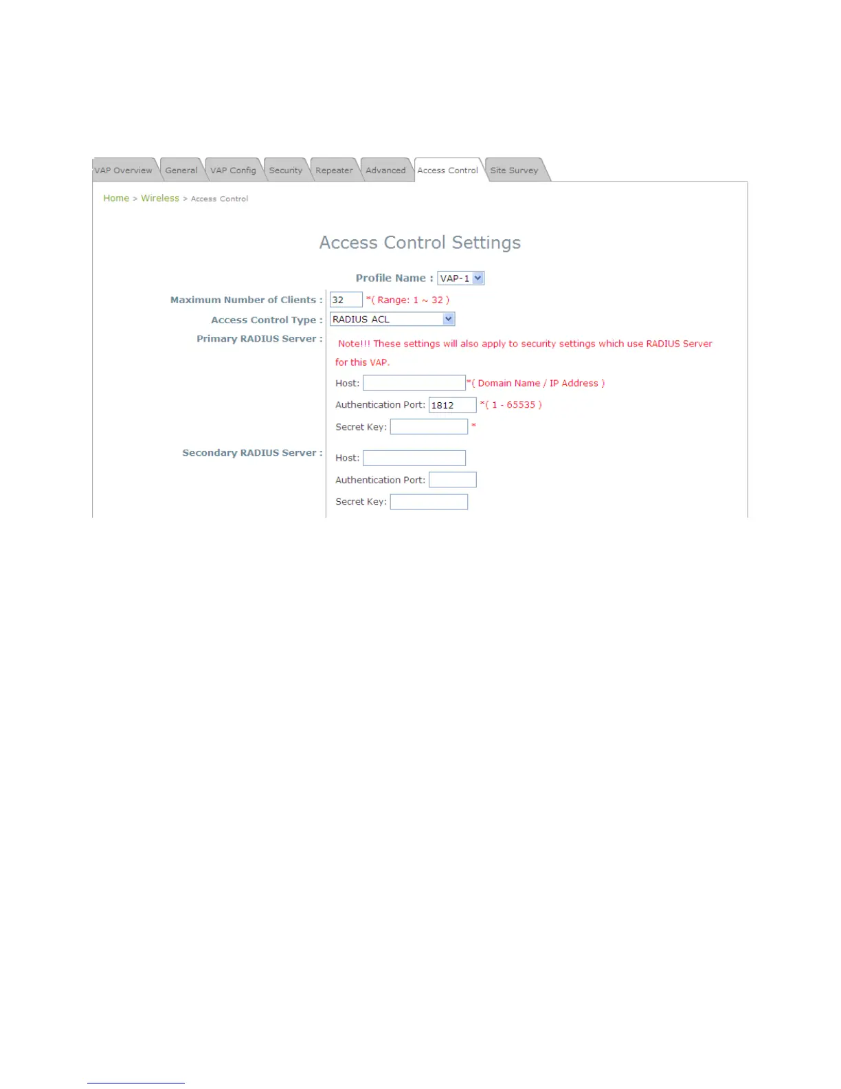 RADIUS server. Please note that each VAP MAC ACL and its security type (shown on the