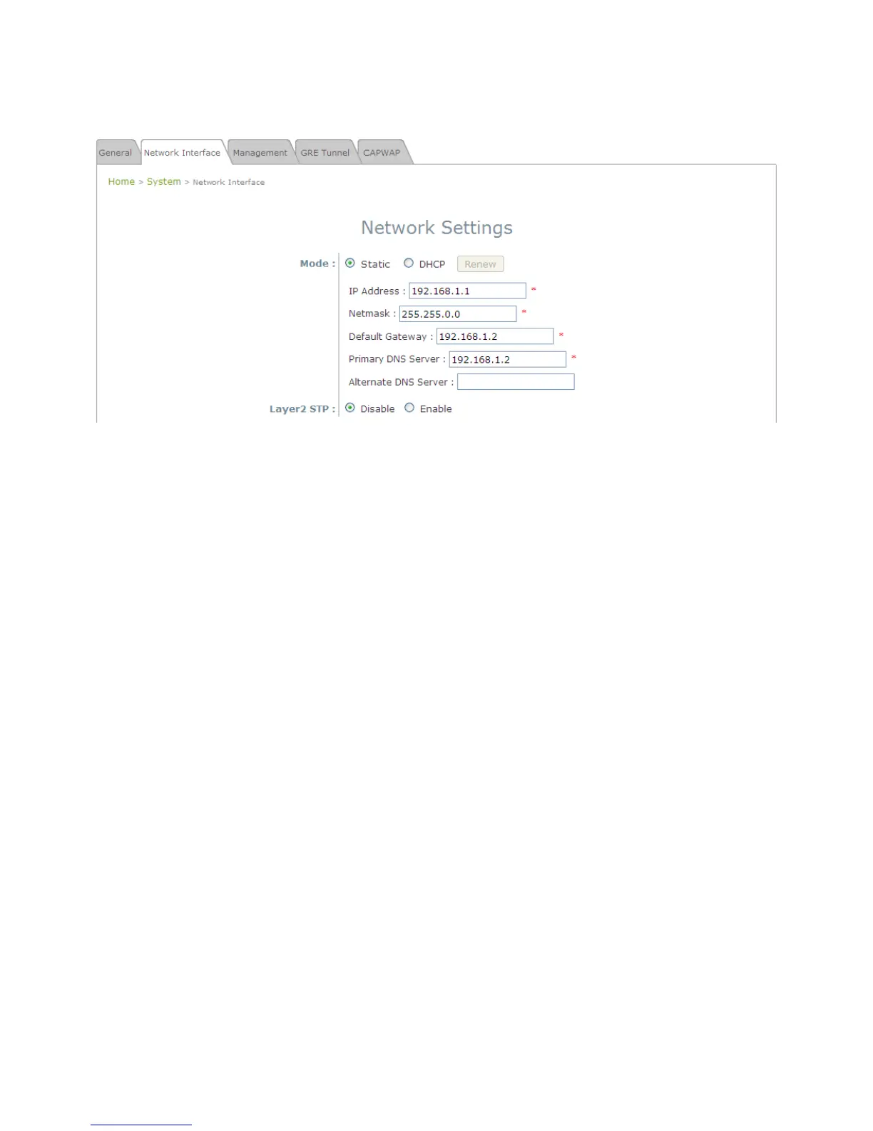 On this page, the network settings of the device can be configured; fields with a red asterisk (i.e. IP