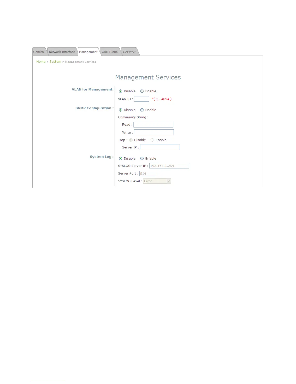 The management services (e.g. VLAN for Management, SNMP, and System log) can be configured