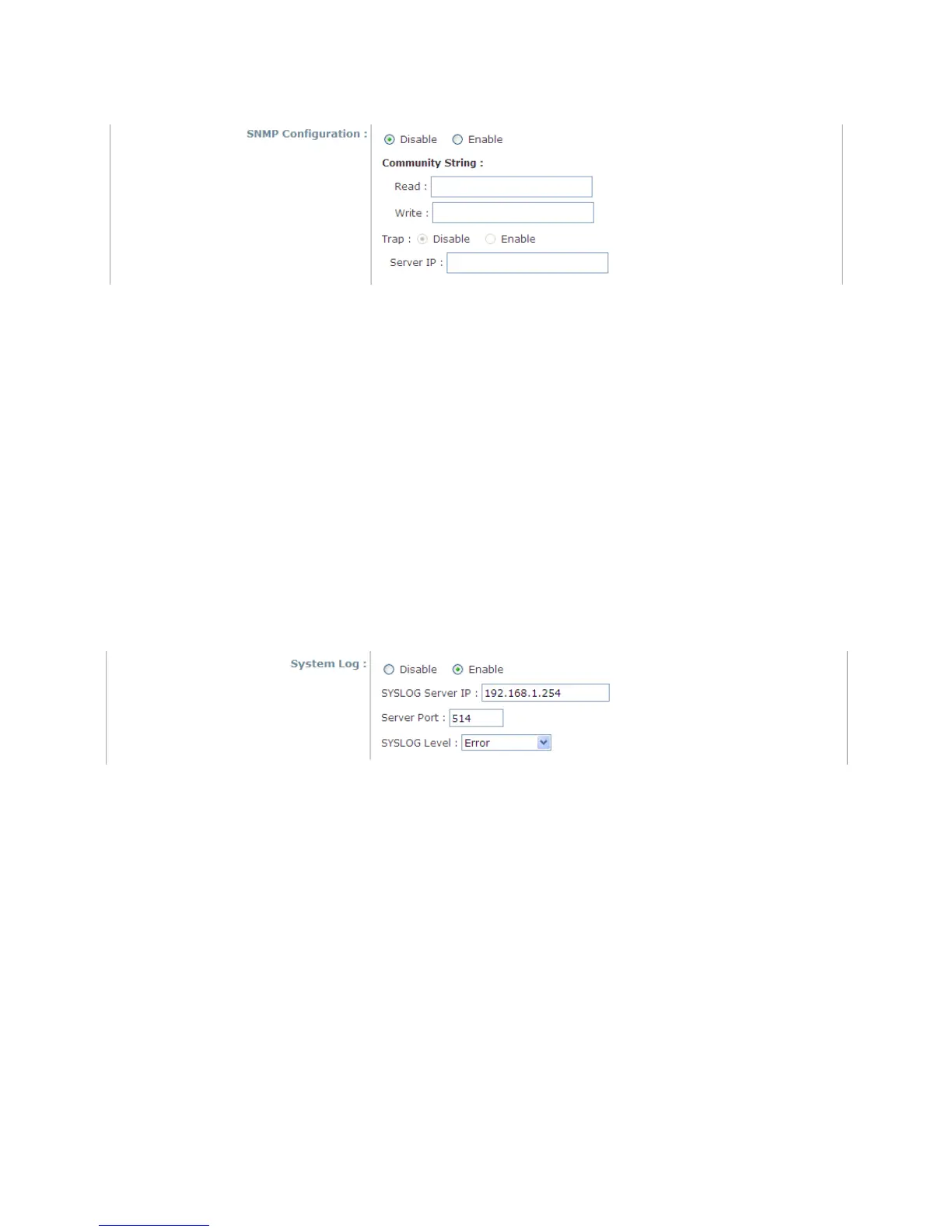 • System Log: By enabling this function, specify an external SYSLOG server to accept SYSLOG messages