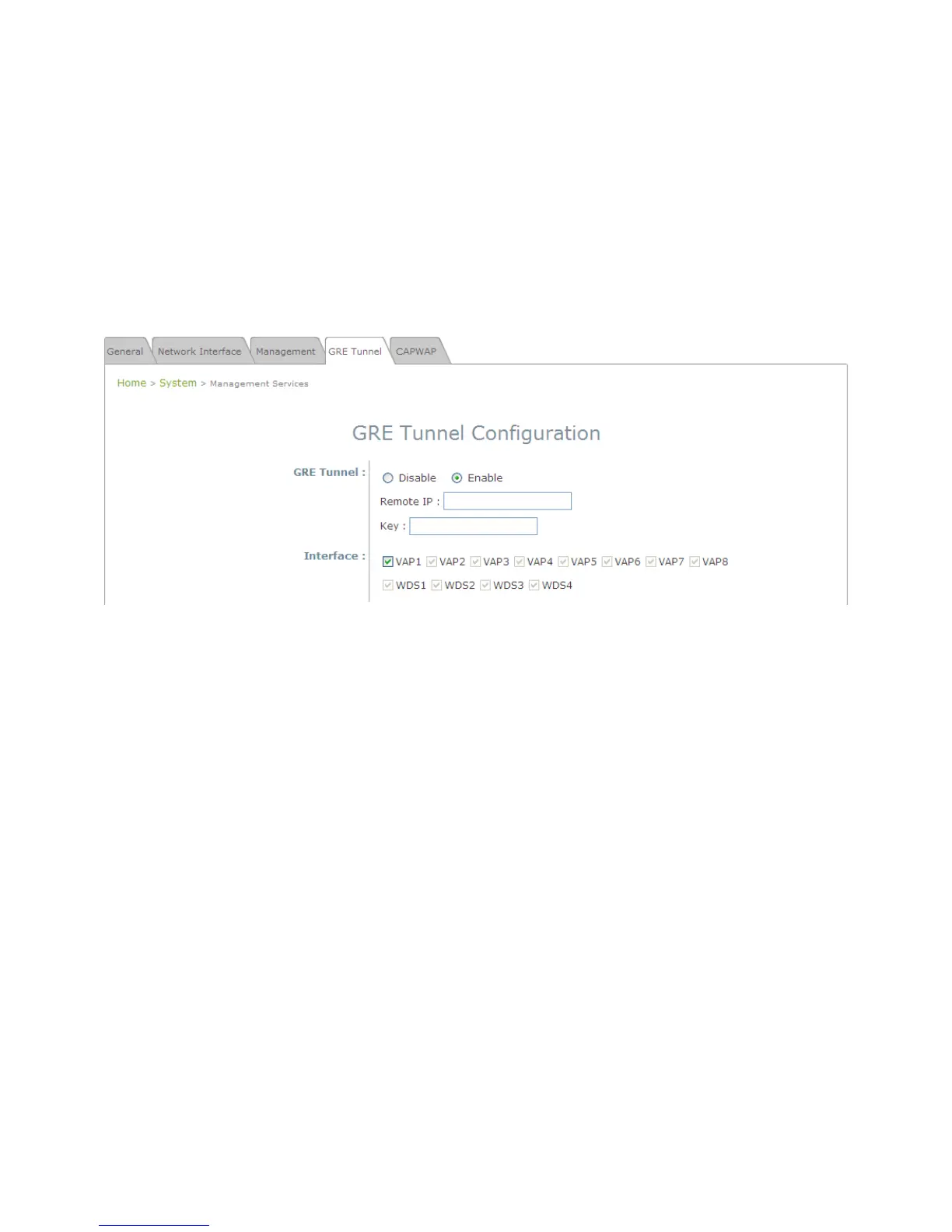 • Interface: Select a VAP or WDS that its traffic will pass through the GRE Tunnel between APs and