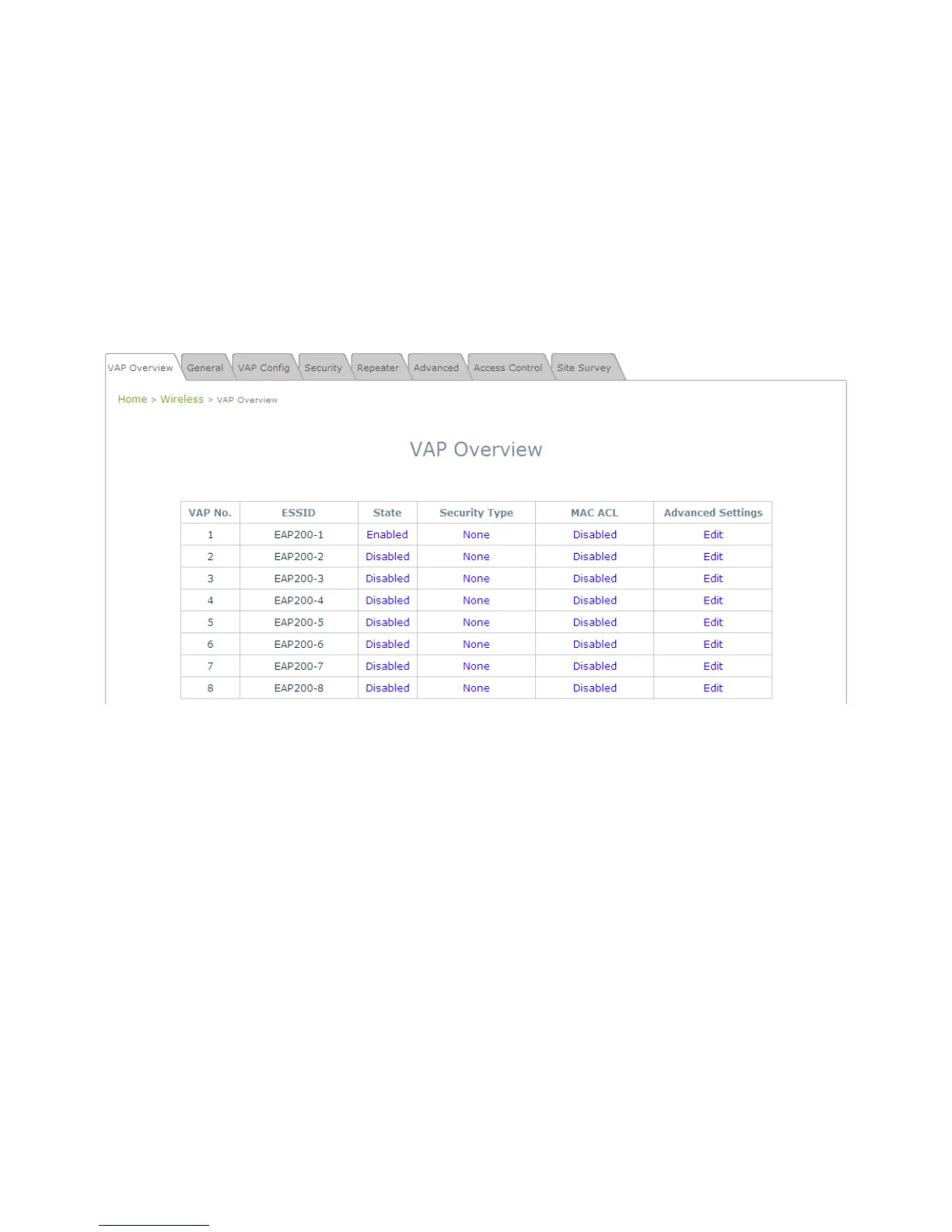 Repeater, Advanced, Access Control, and Site Survey. EAP-200 supports up to eight Virtual Access