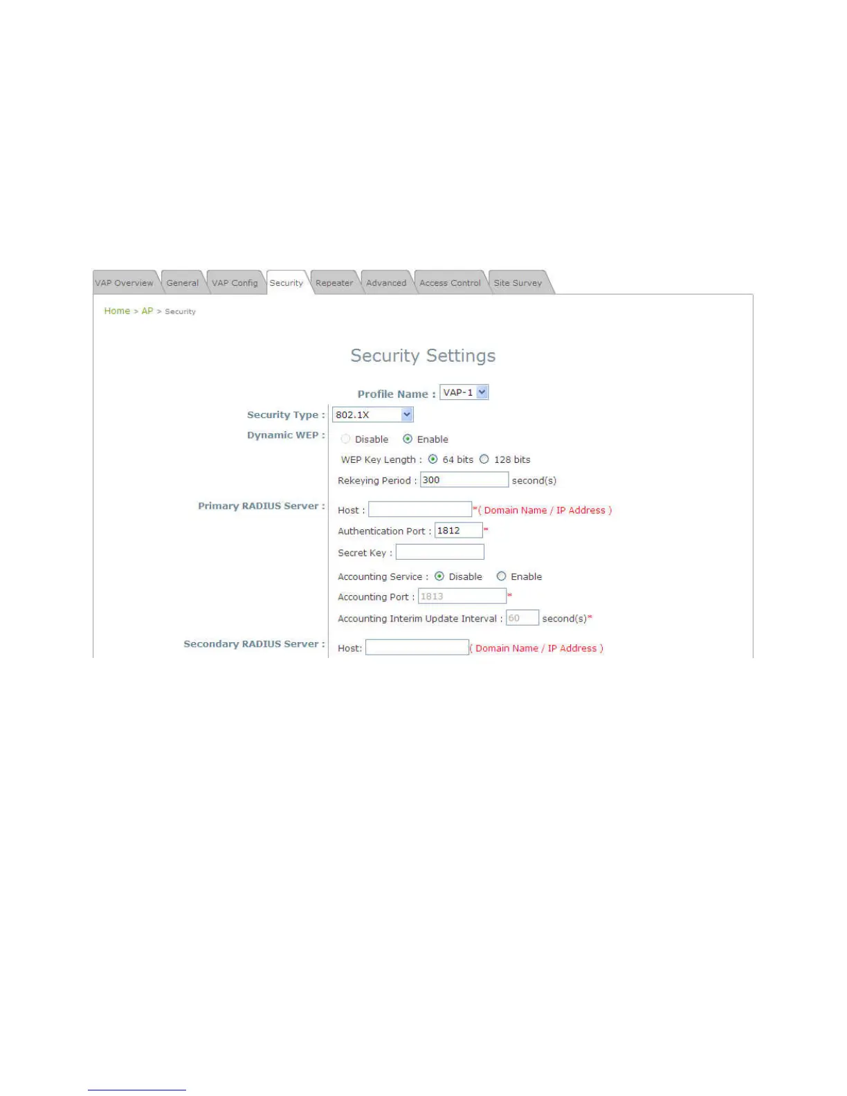 • 802.1X: When 802.1X Authentication is selected, RADIUS authentication and Dynamic WEP are