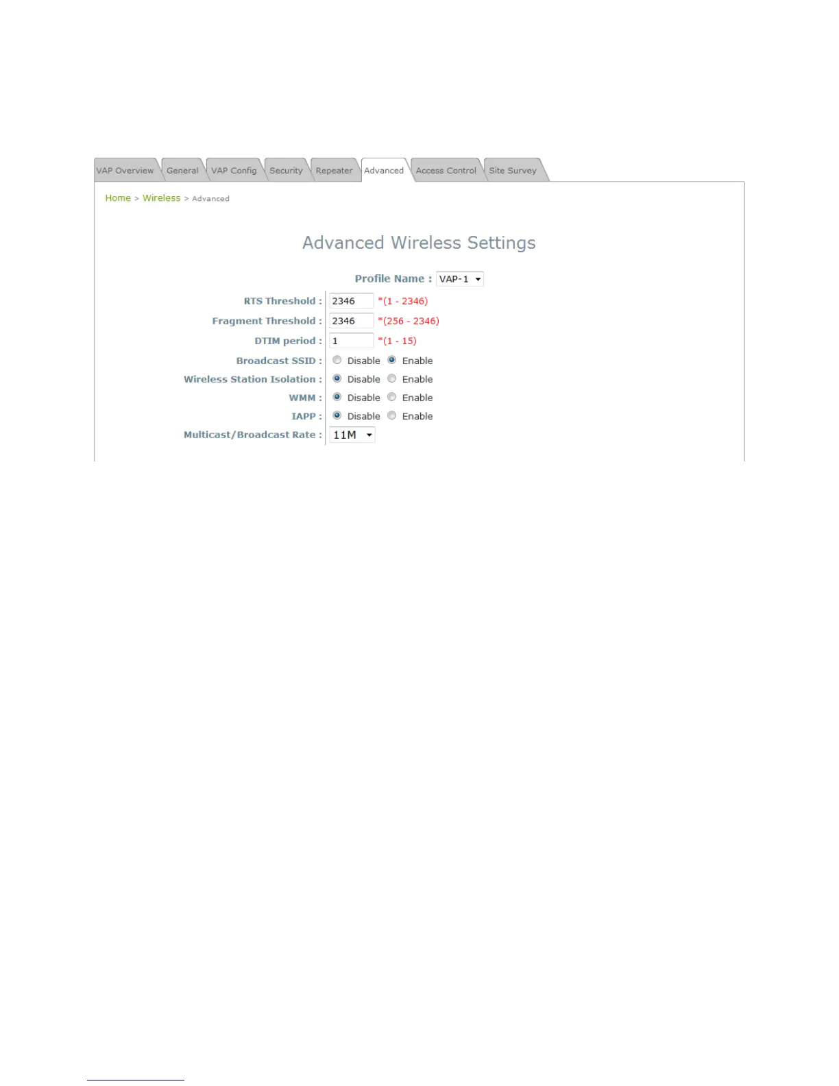 The advanced wireless settings for the EAP-200’s VAP (Virtual Access Point) profiles allow customization