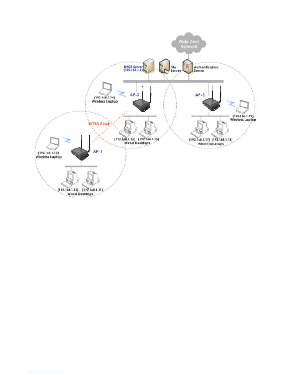 This above deployment scenario illustrates a deployment example using three access points, AP-1, AP-2,
