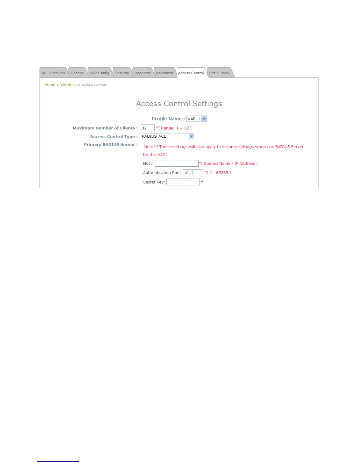 note that each VAP’s MAC ACL and its security type (shown on the Security Settings page) share