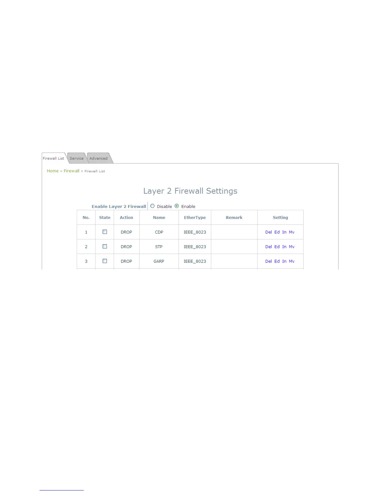 Setting: 4 actions are available; Del denotes to delete the rule, Ed denotes to edit the rule, In