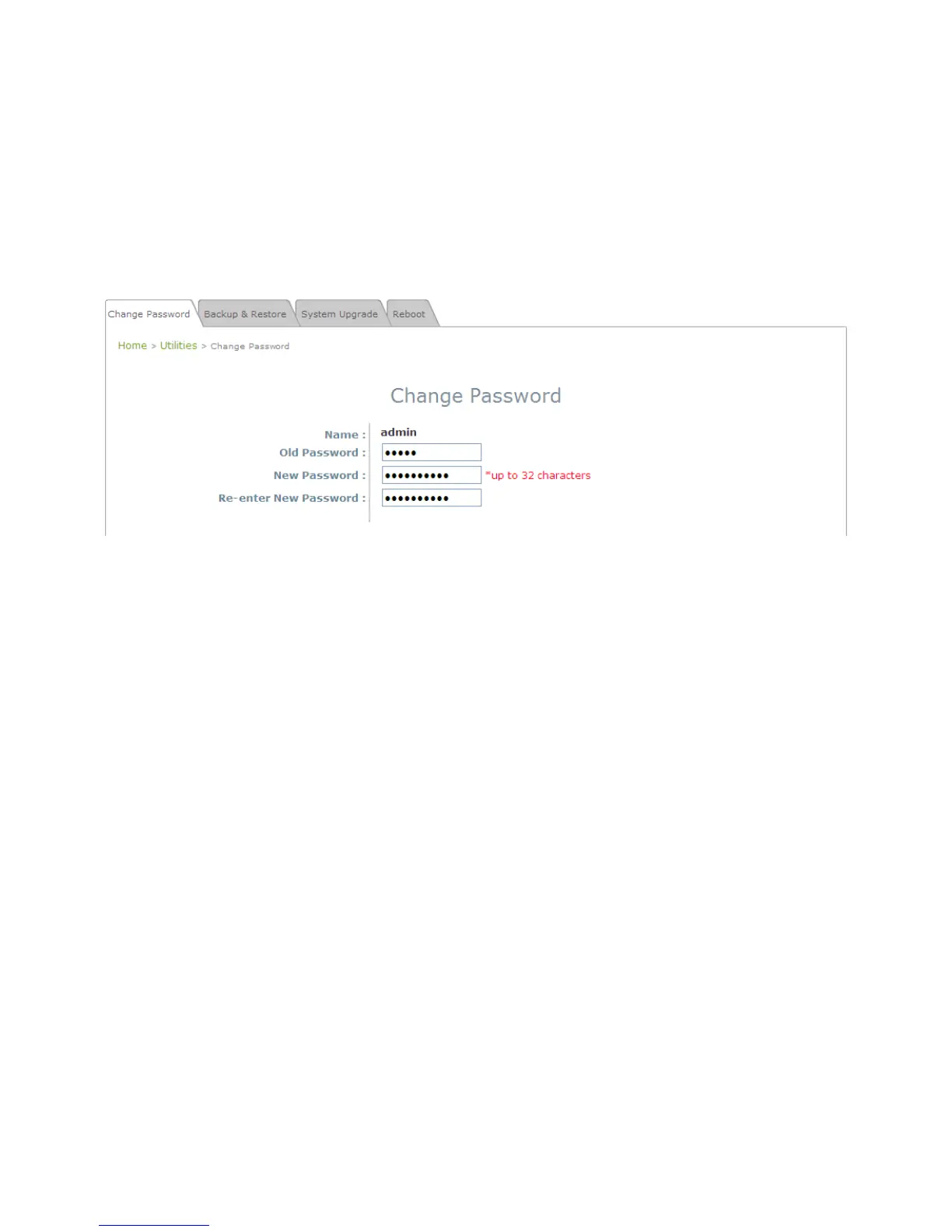 The administrator can change password on this page. Enter the original password (“admin”) and new