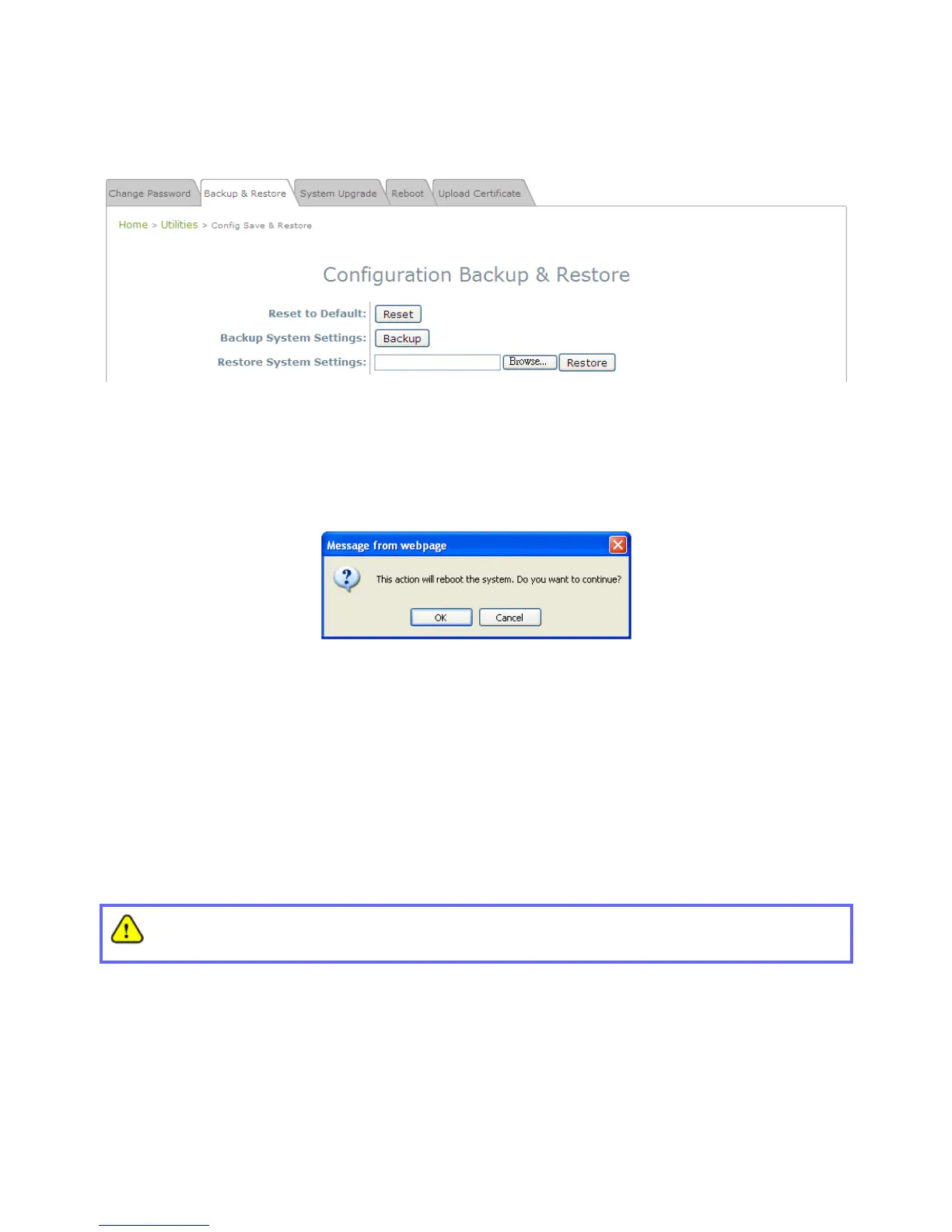Upload to restore the settings. The backup file will replace the active configuration file currently
