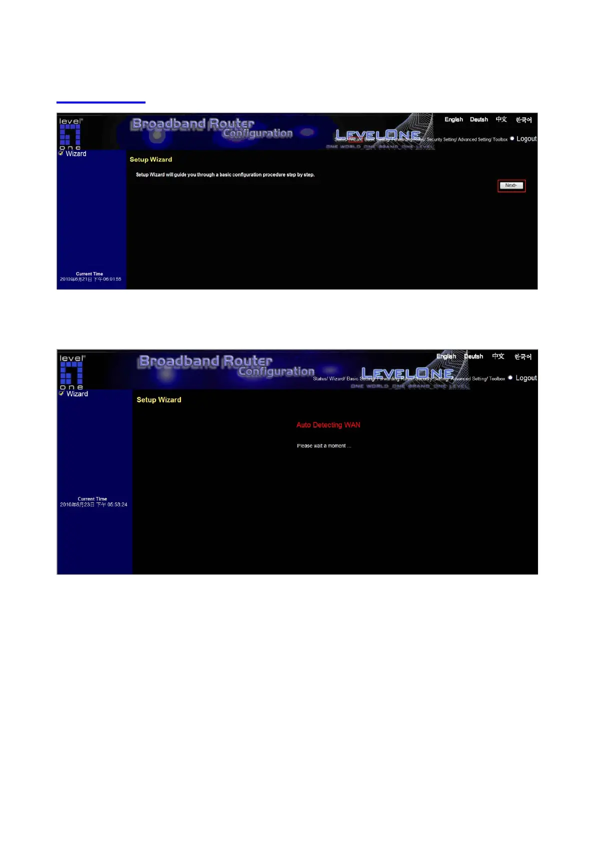Setup Wizard will guide you through a basic configuration procedure step by step. Press