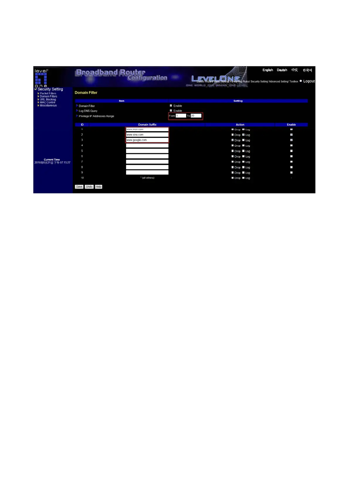 4. URL include “www.google.com” will be blocked, but the action will not be record in log-file.