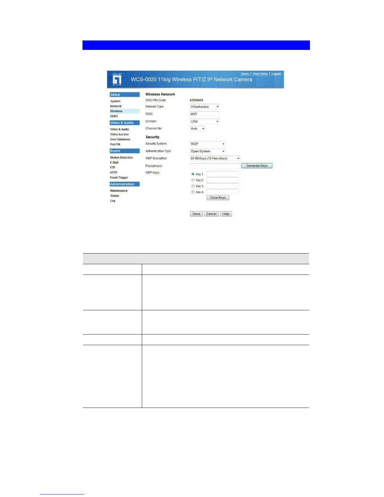 This screen is displayed when the Wireless menu option is clicked.