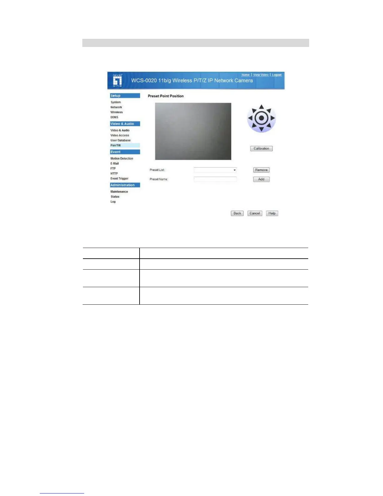 This screen is displayed when the Preset Point Positions button on the Pan/Tilt