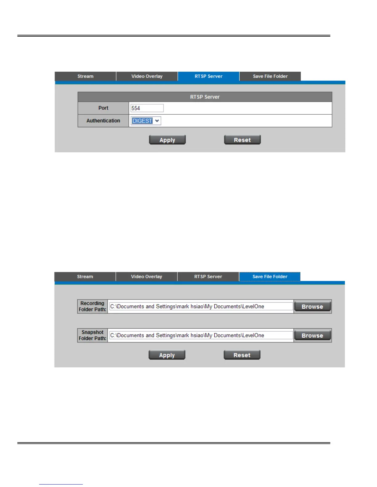 provides two types of security settings for streaming via RTSP protocol: NONE and DIGEST.