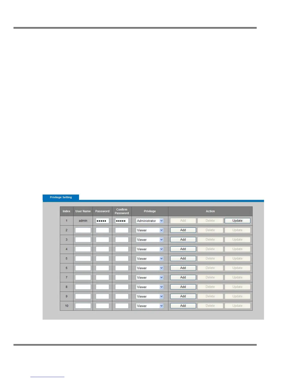 Privilege Setting - Enter the new user’s name and password. Select the privilege for