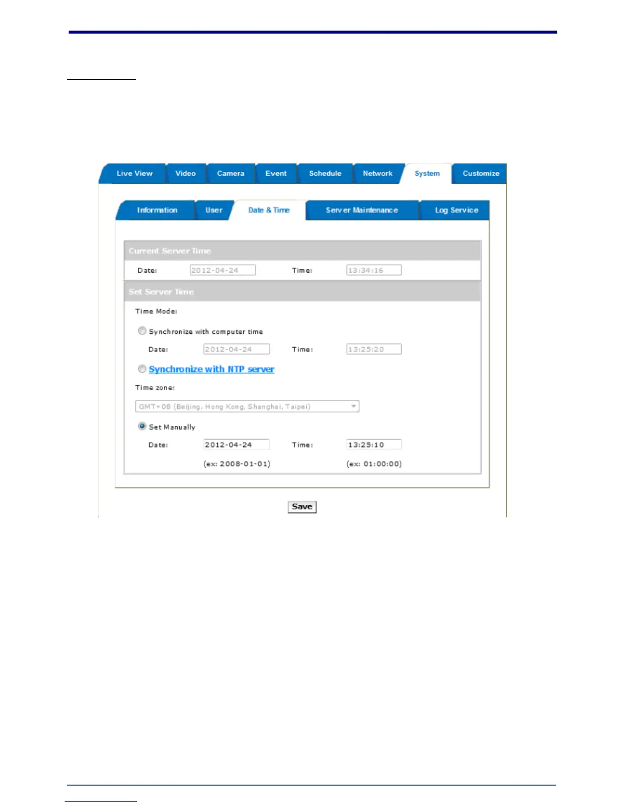 System date/time configuration. Options of synchronizing with PC and NTP server are provided for