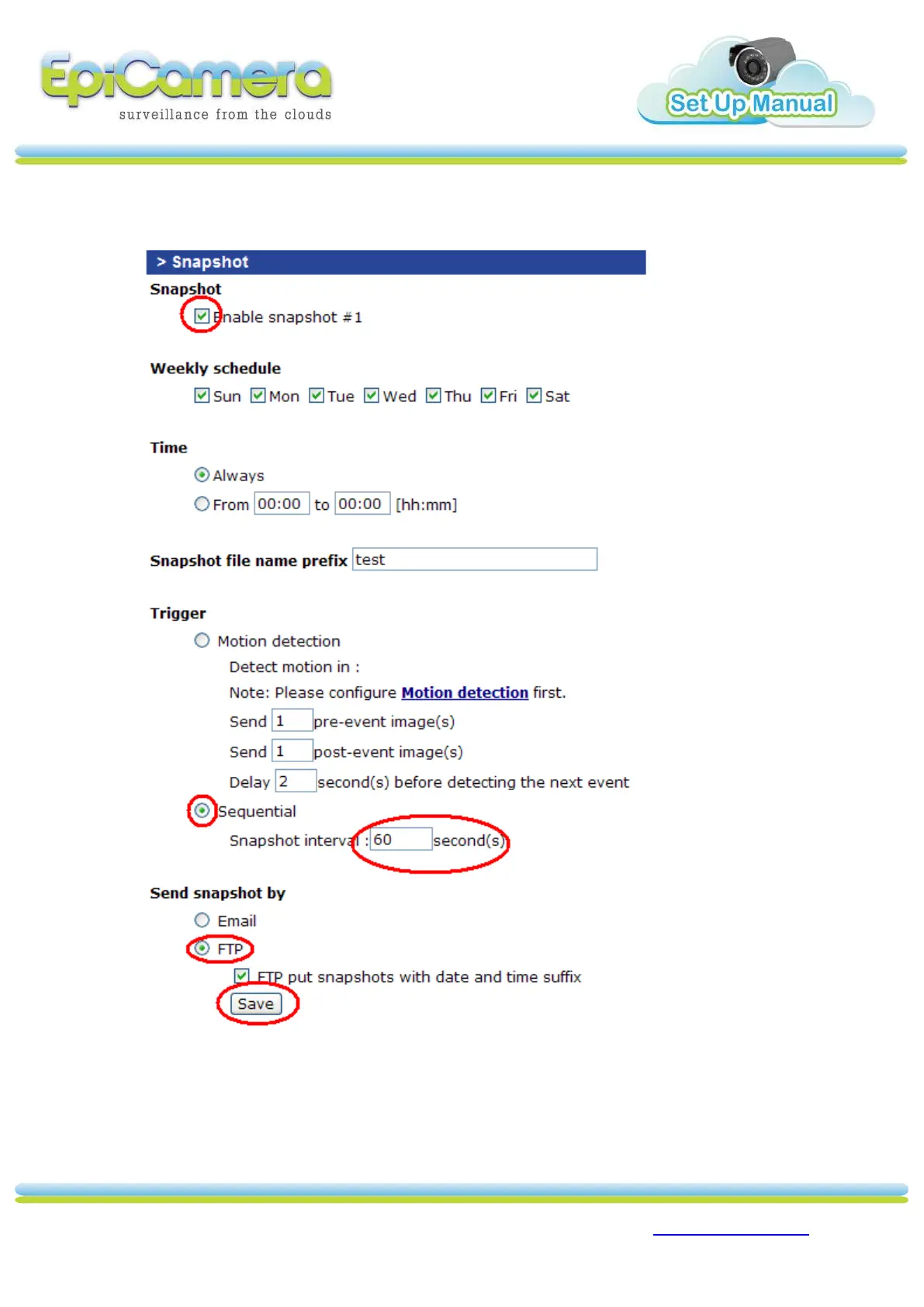 interval timer. Choose send snapshot by `FTP’ and Click `Save’.