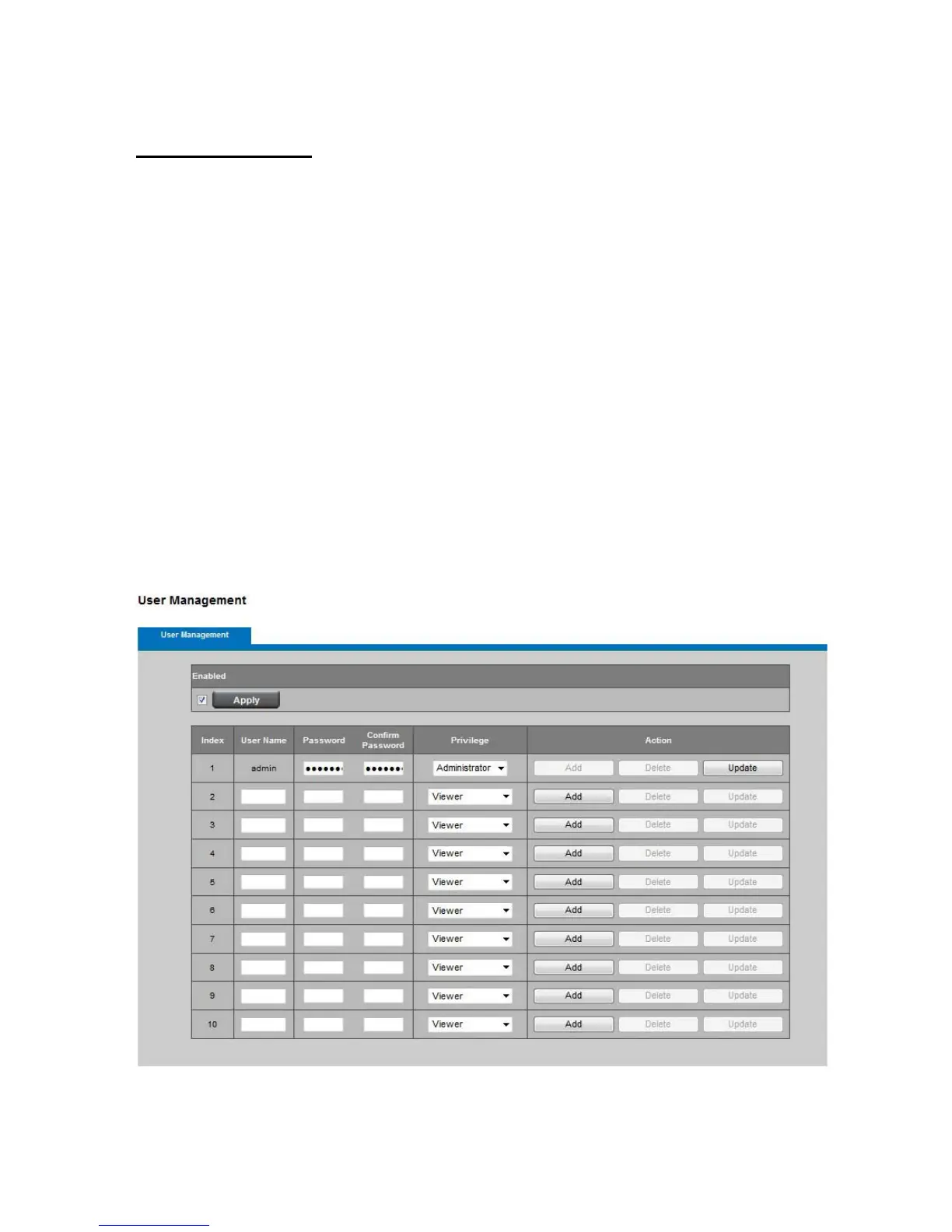 new user account. Click Add to take effect. The administrator account name is “admin”,