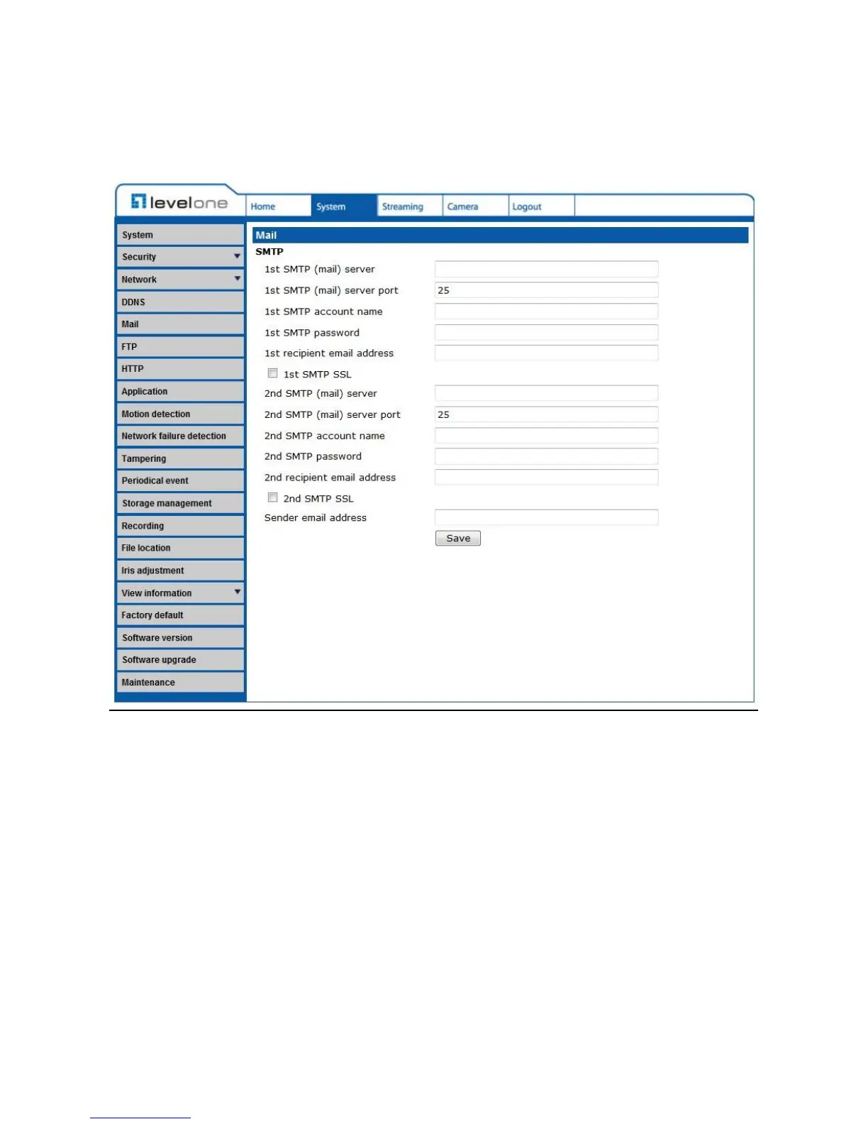 Two sets of SMTP can be configured. Each set includes SMTP Server, Server Port, Account