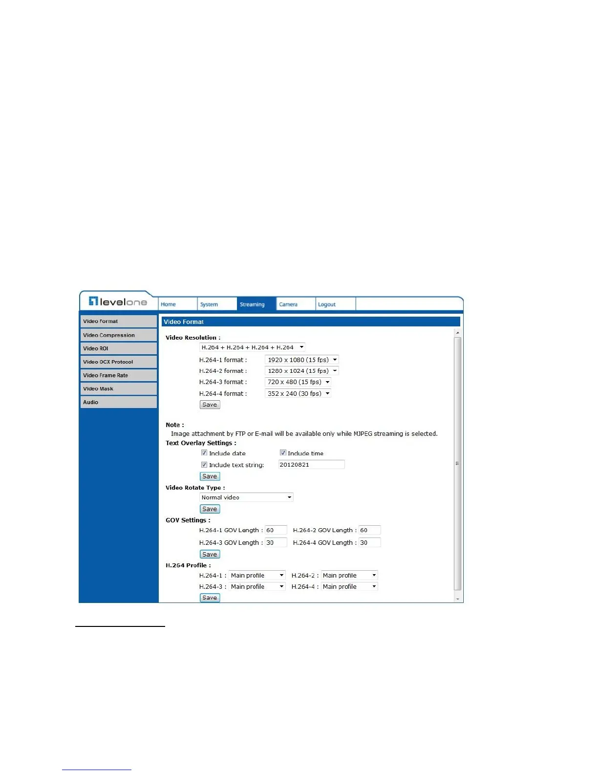 In the Streaming submenus, the Administrator can configure specific video resolution, video