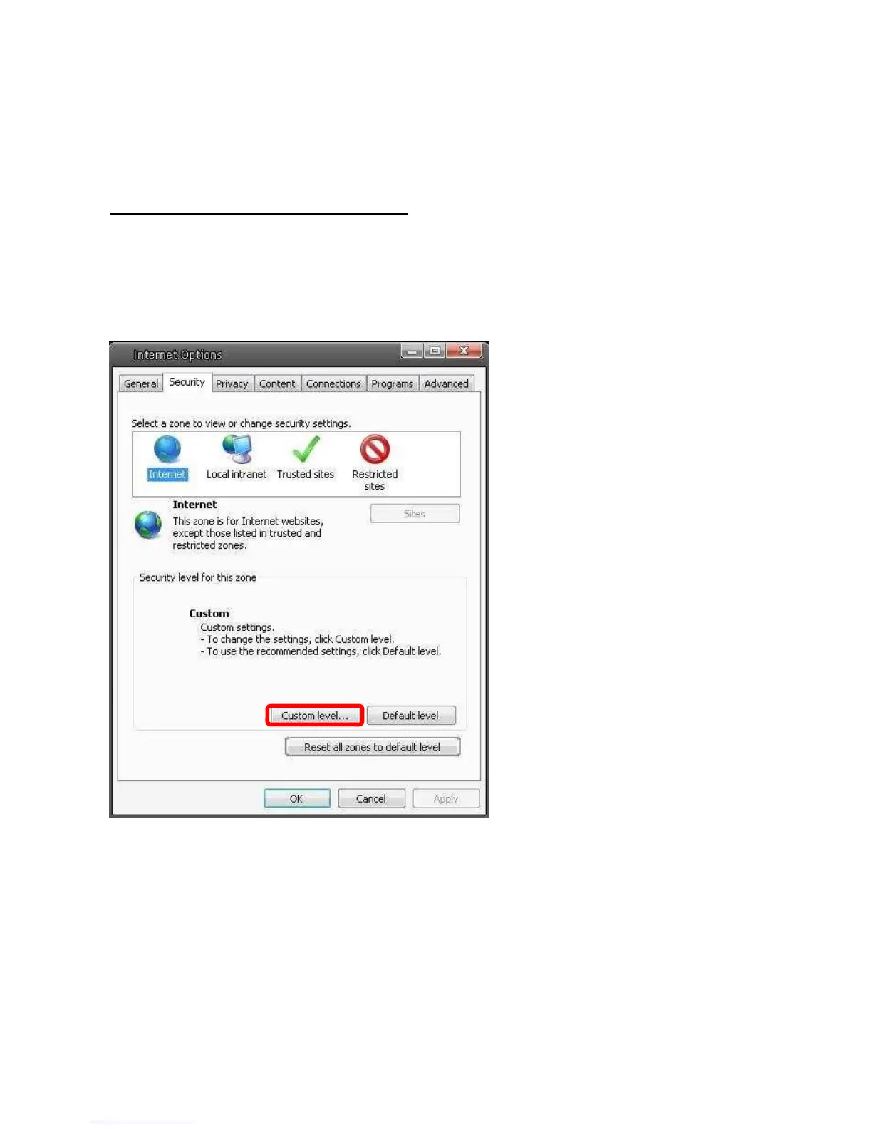 Step 4: Down the page, press “Custom Level” (see the figure below) to change ActiveX