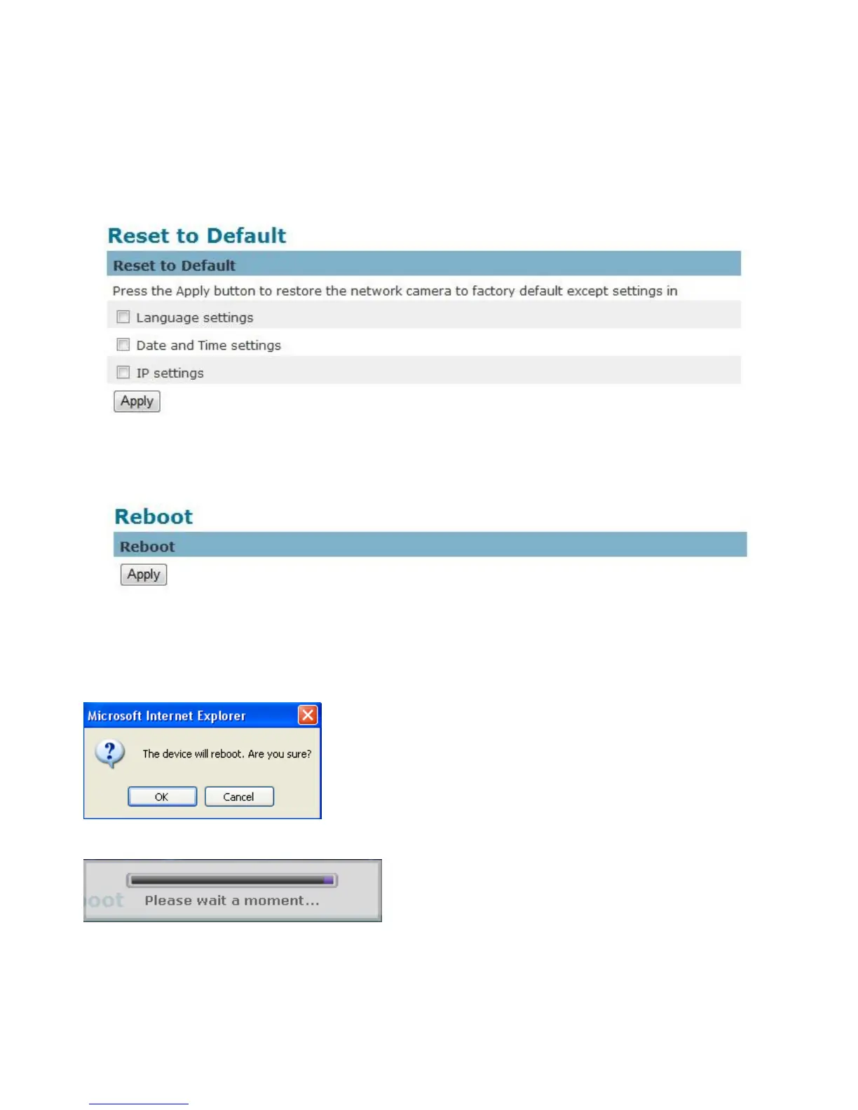 This feature will reboot the camera. Click Apply to begin. A message will pop up asking “The