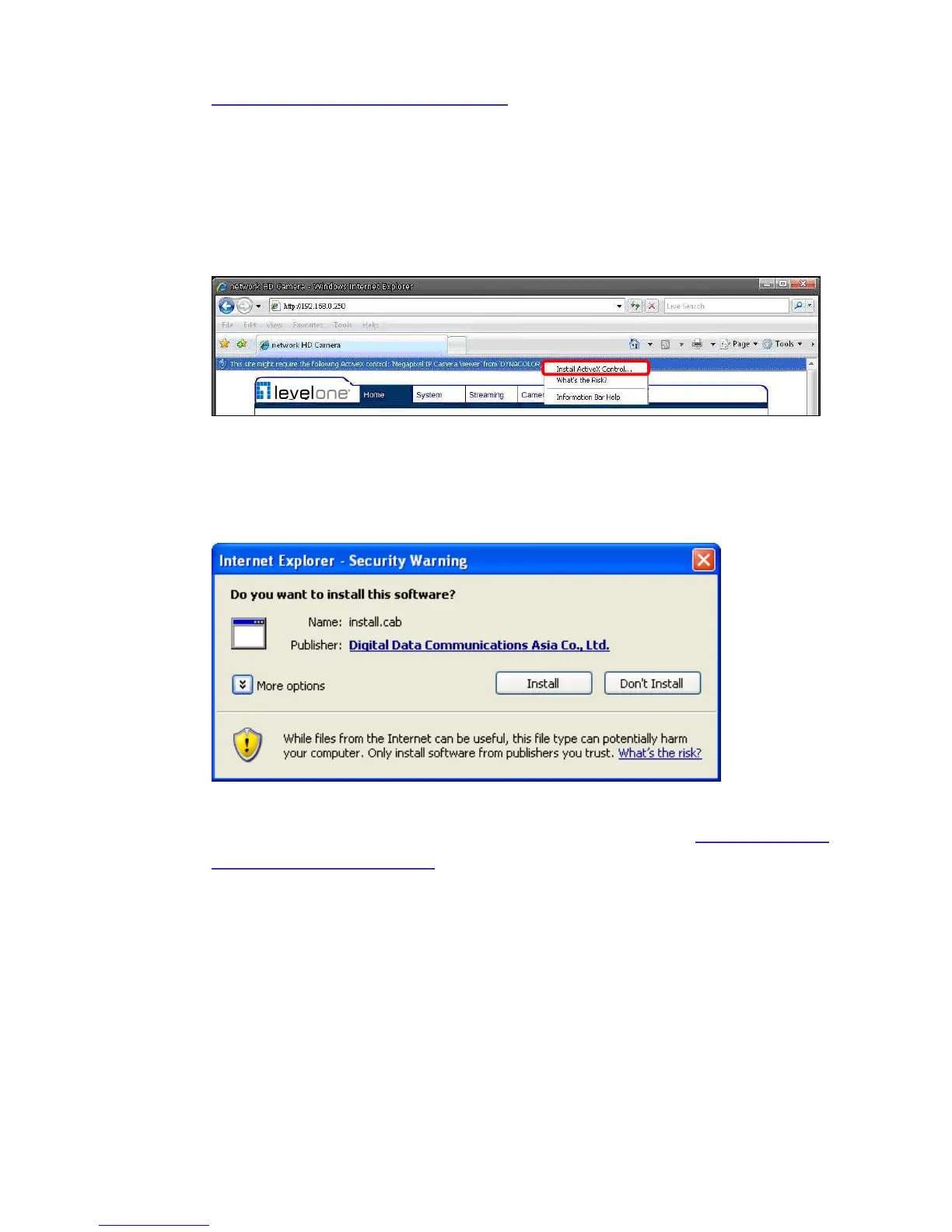permission to install the ActiveX Control for displaying video in browser (see the
