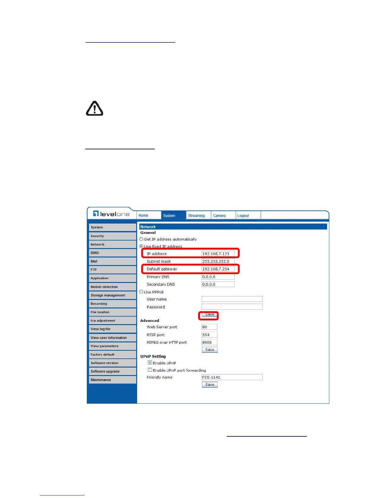 To setup static IP address, select “Use fixed IP address” and move the cursor